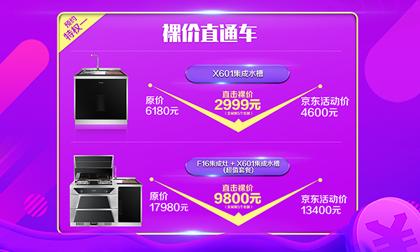 特权一:①购买上派集成水槽X601,原价6180元,直击裸价只要2999元!上派集成水槽:匠心之作,手工品质之美、精密拉丝工艺,经久耐用、密封防漏,双层过滤;溢水过滤,安全可靠、43L超大水槽,一盆水搞定洗锅洗碗、洗、沥、切、储,一槽搞定、一体成型,X型导流线设计,下水更高效、黄金R10角设计,清洗更方便、S型防臭下水,排除异味更省心、77L超大储物,锅碗瓢盆皆可收纳、360°万向水龙头,冷热随控。