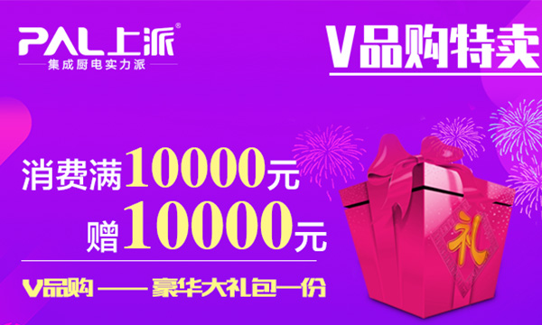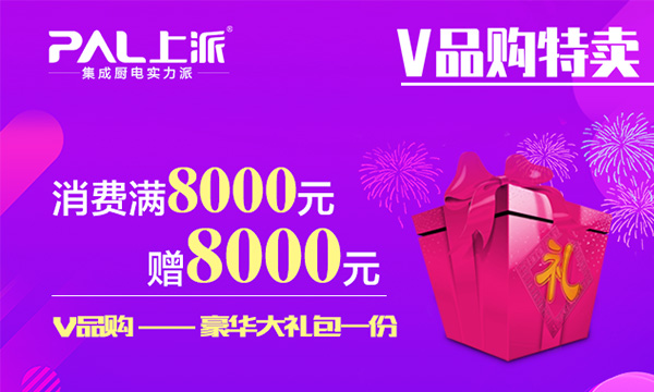 活动期间除了产品给予特惠的直购价,另外还有V品购赠送,除裸价直通车活动外,在上派全国门店购其它任意上派产品均可享受以下优惠:1.消费满6000赠6000元、满8000元赠8000元、满10000元赠10000元V品购豪华大礼包一份!