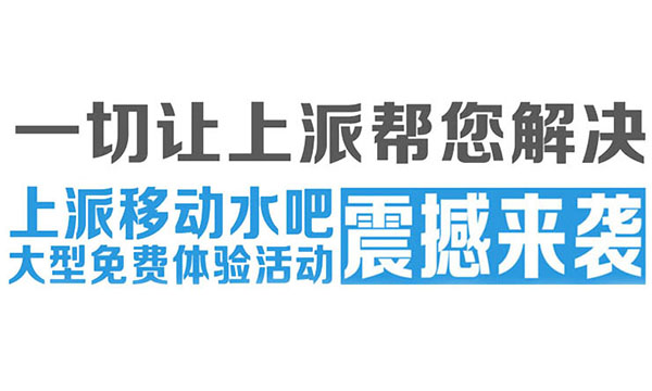 集成灶十大品牌、净水器十大品牌上派移动水吧无空间限制、无水源限制、无淹水隐患、无二次污染、无需上门安装,一台上派移动水吧抵过净水机、饮水机、电热水壶、管线机、保温瓶、调温杯,水质通过中国CMA108项水质严格检测,远超欧盟、美国水质!集成灶十大品牌、净水器十大品牌斥资千万助力终端,大型移动水吧免费体验,好水喝出健康来,这个夏天,让上派移动水吧陪伴您!