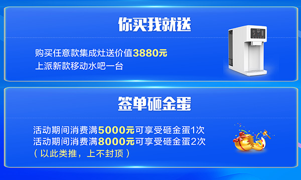搞事搞事!6月12日——6月27日,集成灶十大品牌、净水器十大品牌上派集成灶全国联动,618年终钜惠火爆来袭,用更低的价格,享受更好的品质,我们的目的只有一个,为您省钱!省钱!省钱!只要你来,我们定不负你所望,你要的特价,给!你要的礼品,送!多重好礼,强势来袭!进店扫码即可领取红包一个,另外,F16集成灶+X601集成水槽(超值套餐)原价17980元,直击裸价只要9800元!单品X601集成水槽原价6180元直击裸价只要2999元,购买任意款集成灶送价值3880元上派新款移动水吧一台,活动期间消费满5000元可享受砸金蛋1次,消费满8000元可享受砸金蛋2次(以此类推,上不封顶)!