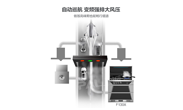 与F16不同的是,F130X动力系统方面采用了智能变频增压电机系统,现在小区多采用公共烟道设计,烹饪高峰期公共烟道内排烟增多,排烟容易受阻,F130X8档风速自由变换,遇强则强,无惧高层公共烟道,动力更强悍!