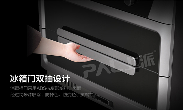 优势四:隐形三抽屉。目前市场拥有的带有消毒柜款集成灶都是普遍俩抽屉,拥有消毒烘干功能,而上派集成灶不仅拥有上下层消毒柜,还拥有隐形三抽屉设计,灶具下方拥有15L黑钛金与高氧化铝食用级材质储物柜,可放置餐具,避免了餐具杂乱繁琐问题。