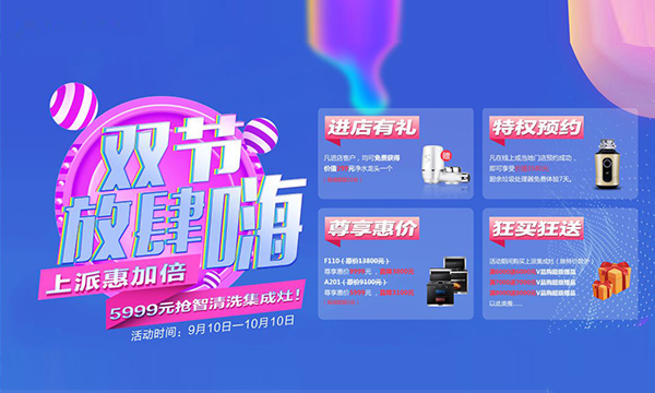 双节活动火爆开启!满足那些想要装修新家的朋友,都能在恰好的时机,尽兴挑选自己喜欢的产品,还能享受到前所未有的优惠福利?;疃诩銯110集成灶直降3800,只需9999元,A201集成灶直降3100元,仅需5999元,此外,活动期间购买上派集成灶除特价款外,满6000送6000V品购大礼包、满7000送7000,以此类推,超多惊喜上派门店等你。