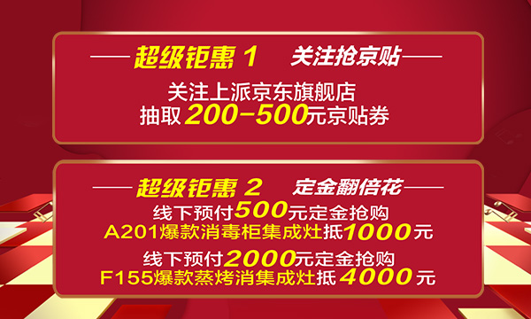 集成灶十大品牌上派集成灶双十二爆品节,12月6日——1月1日,全民疯抢巅峰钜惠,满多少送多少,凡进店客户扫码关注上派京东旗舰店,线下抢双12超级钜惠。超级钜惠一:关注上派京东旗舰店,就能抽取200-500元京贴券;超级钜惠二:线下预付500元定金抢购,A201爆款消毒柜集成灶就能抵1000元,预付2000元定金抢购F155爆款蒸烤消一体集成灶就能抵4000元;超级钜惠三:爆品A201消毒柜款集成灶、F155蒸烤消一体集成灶,双十二线下抢京东超底价!用最实惠的价挑选心仪的集成灶,你能错过?