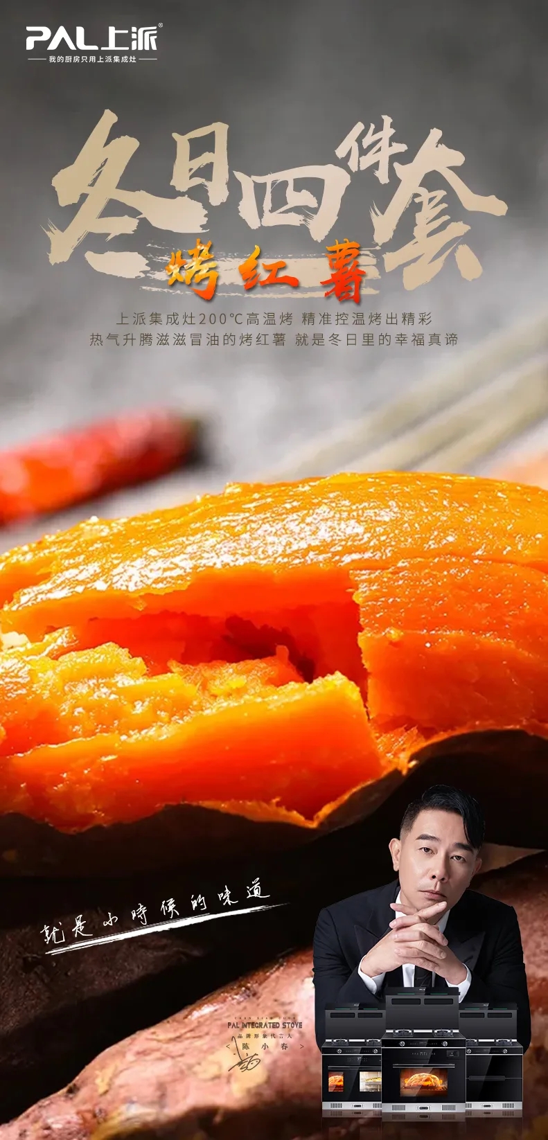 你能想象沾了蜜的红薯所带来的的幸福感吗?入口即化香气扑鼻,上派集成灶200℃高温烤,精准控温烤出精彩,热气腾腾的烤红薯,就是冬日里的幸福真谛。