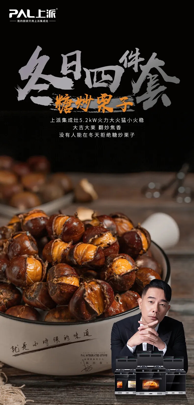 走在寒冷的街头总会在栗子小店门口驻足,香甜软糯别有一番风味。上派集成灶5.2kW火力,大火猛小火稳,大吉大栗,翻炒焦香,没有人能在冬天拒绝糖炒栗子。
