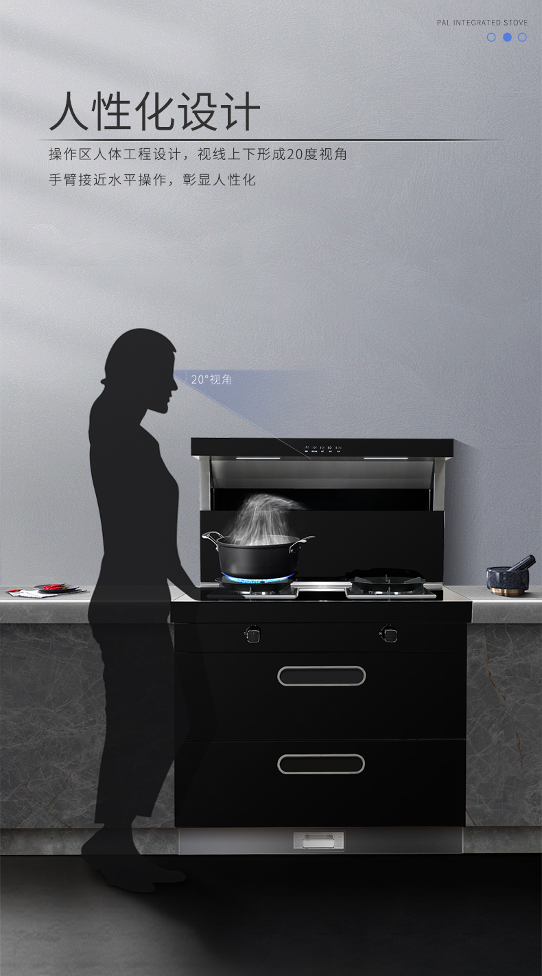 经过数千次市场调查,上派集成灶F3系列的操作区采用了人体最舒适的设计,视线上下20°视角,手臂接近水平操作,让人在使用集成灶过程中达到最舒适的放松效果,做菜“不费吹灰之力”。