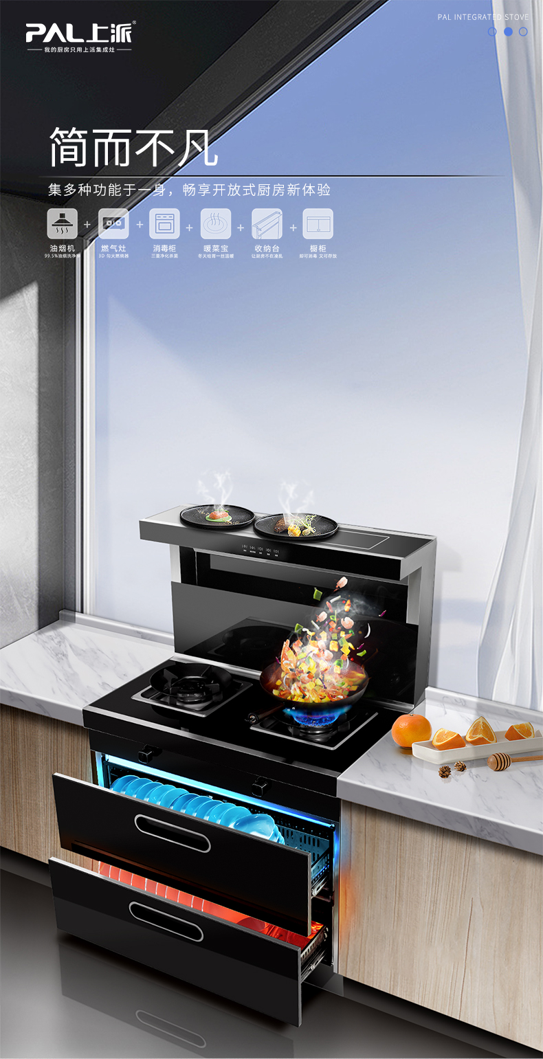 现代化的厨房,没有什么是一台上派F3集成灶不能解决的。它集油烟机、燃气灶、消毒柜为一体,改善传统厨房的分散布局,让开放厨房走进千家万户。