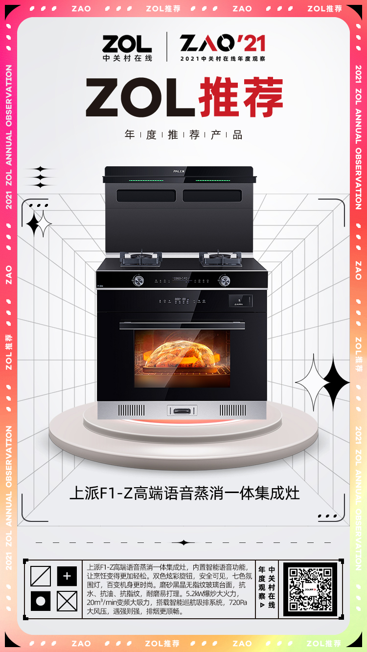 喜报丨上派F1-Z高端语音蒸消一体集成灶荣获中关村“ZOL 推荐奖”