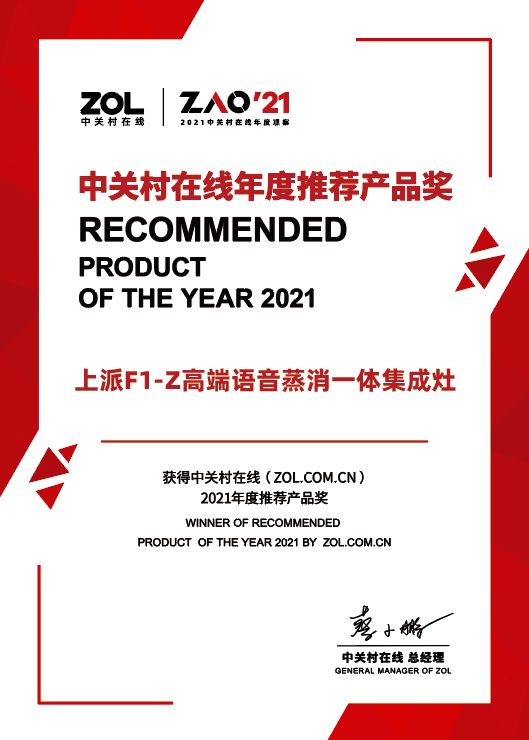 在本次评选中,上派F1-Z高端语音蒸消一体集成灶凭借全面的智能功效、尖端的行业技术和极致的用户体验,得到了专业评审和广大消费者的一致认可,荣膺“2021年度推荐产品奖”。
