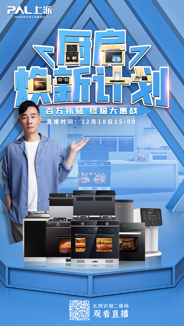 2021年12月18日15:00上派直播间,为你360°解读上派“厨房焕新计划”活动,超实惠,超给力,我们不见不散!
