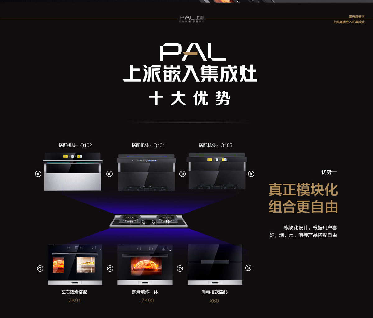 上派嵌入式集成灶的模块化设计,给了消费者最大限度的选择空间,消毒柜、蒸箱、蒸烤消一体、左右蒸烤,任意搭配,百变百搭,自由随心。