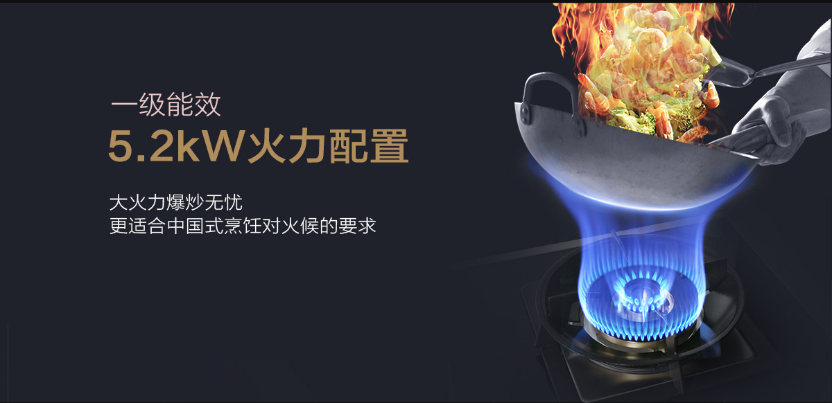 5.2kW大火力,爆炒无忧,更适合中式烹饪对火候的要求。大火够猛,小火够稳,能效使用率更高,更节能。