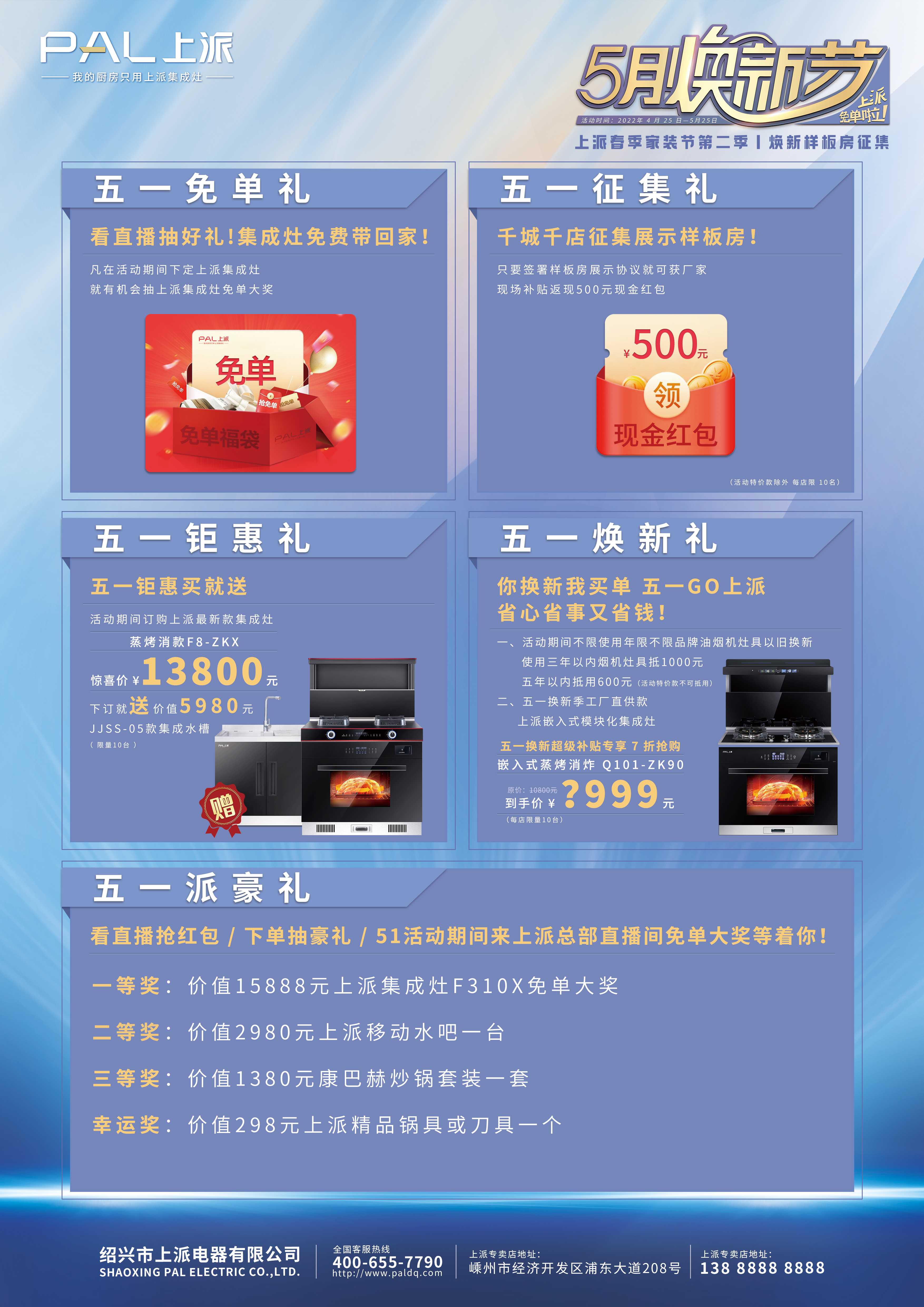 凡在活动期间下定上派集成灶就有机会抽上派集成灶免单大奖,看直播抽好礼,集成灶免费带回家!!