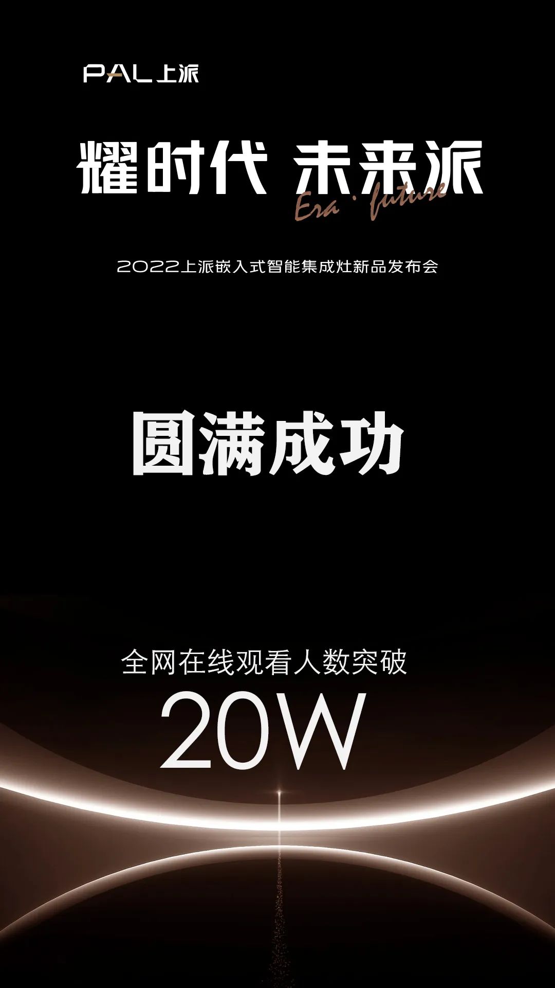 411,耀时代,未来派上派新品发布会盛大开启,众人期盼已久的上派嵌入式集成灶终于揭开了神秘面纱,引爆热议,直播间人数超20万,人气爆棚!