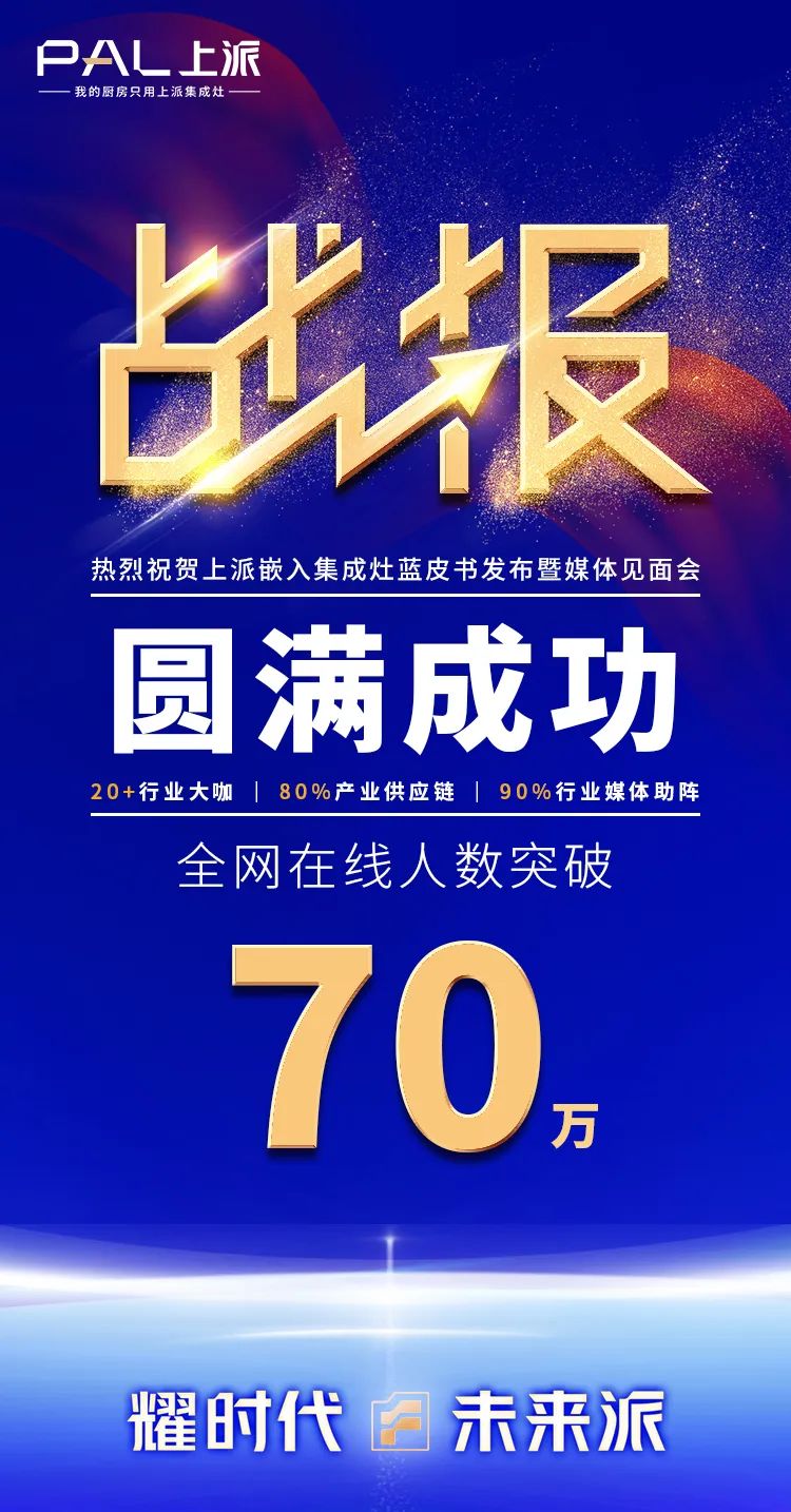 423日,上派嵌入式集成灶蓝皮书发布暨媒体见面会在浙江嵊州拉开帷幕。上派全体高层领导、众多行业大咖、90%的行业媒体云集,一同见证行业的华丽盛典。全网观看人数突破70万,受关注程度可见一斑!