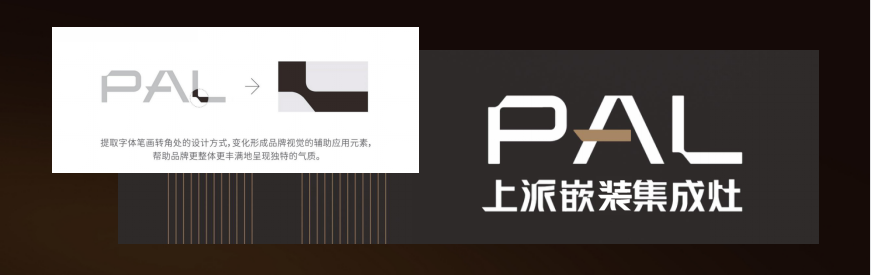 新形象传承之前的品牌设计元素,进行优化设计,使字体更简洁,细节更精致,整体更时尚,笔画转角连接处的圆角设计,体现了上派的匠心品质。提取字体笔画转角处的设计方式,变化形成品牌视觉的辅助应用元素,帮助品牌更整体更丰满地呈现独特的气质。