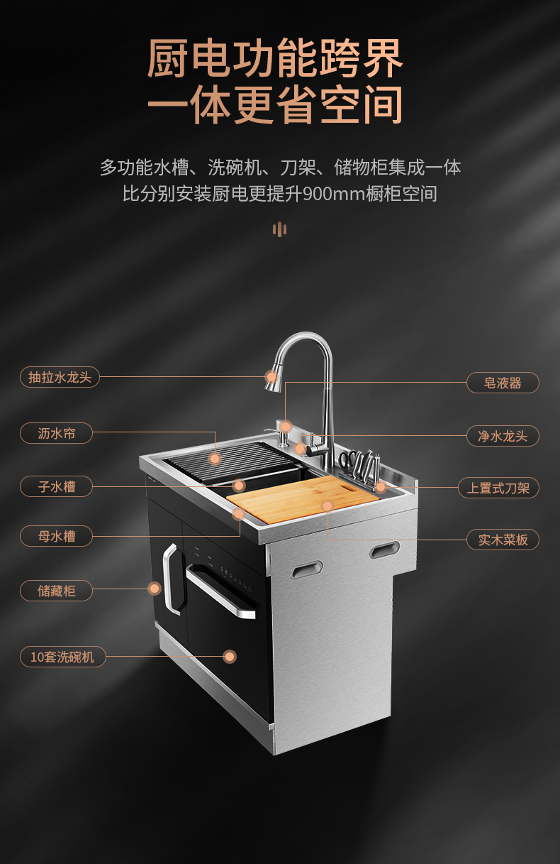 上派JJSS-SP0B8集成水槽洗碗机集多功能水槽、洗碗机、刀架、储物柜为一体,比分别安装厨电更提升900mm橱柜空间,多功能集成灶满足任意下厨需求,只有你想不到的,没有上派JJSS-SP0B8集成水槽洗碗机做不到的。