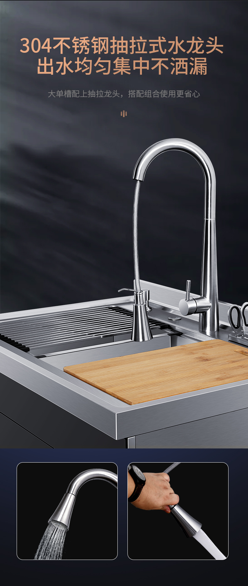 配备304不锈钢抽拉式水龙头,使得上派集成水槽洗碗机拥有异于普通水槽的优点——出水均匀,集中不洒漏,水花不四溢,环保更节能。