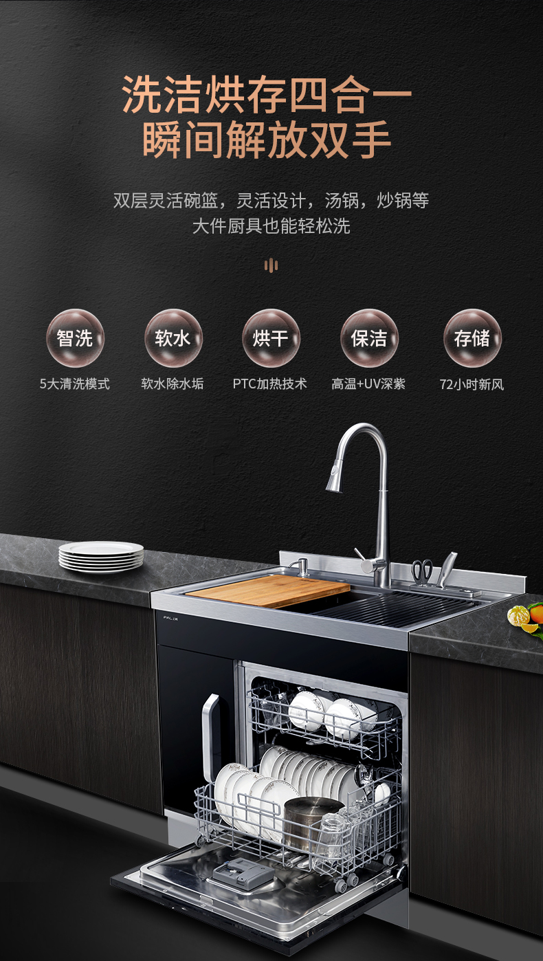 智洗+保洁+烘干+存储=上派JJSS-SP0B8集成水槽洗碗机,一台顶四台的终极厨房新体验。双层灵活碗篮,汤锅、炒锅等大件厨具也能轻松洗,瞬间解放双手,厨房生活更舒心。
