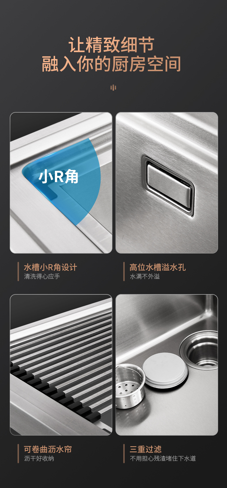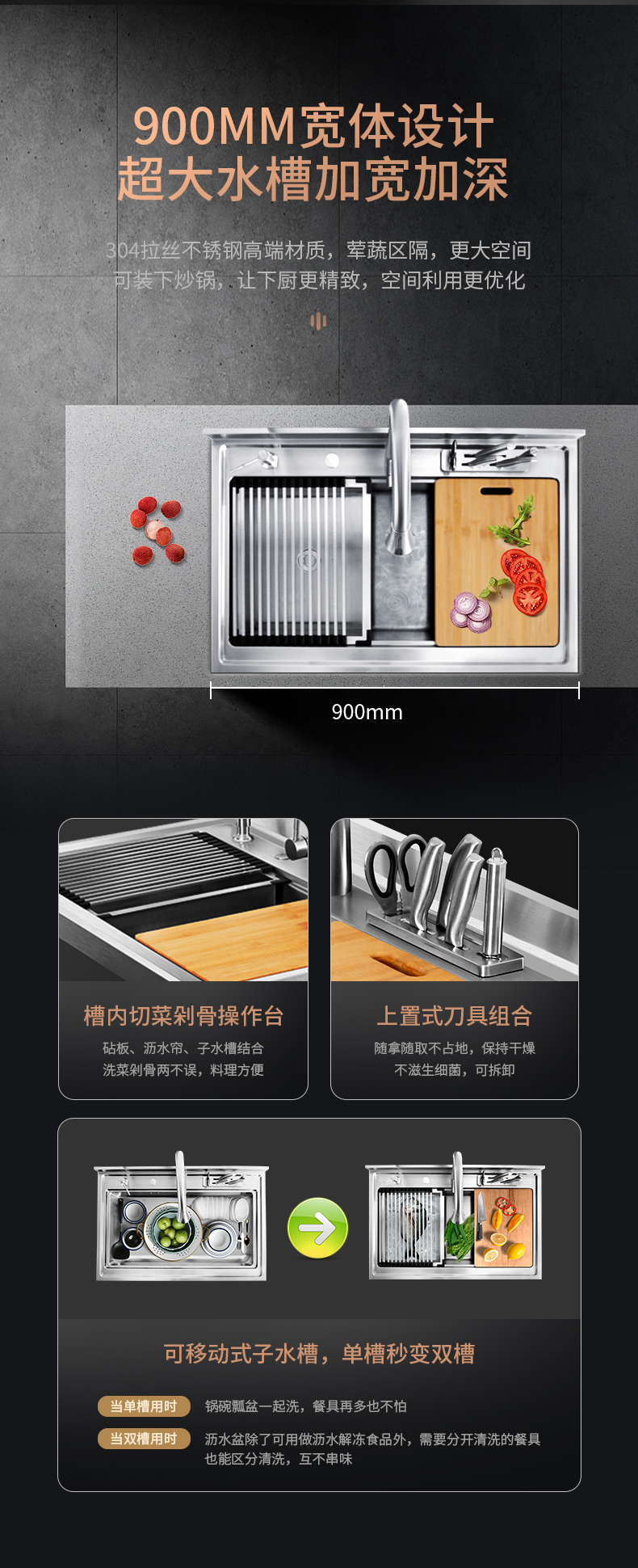 304拉丝不锈钢的高端材质,让上派集成水槽洗碗机900mm宽体设计的加宽加深超大水槽愈显高级?;缡叻掷?,大空间可装下炒锅,空间利用更合理,让下厨更精致。