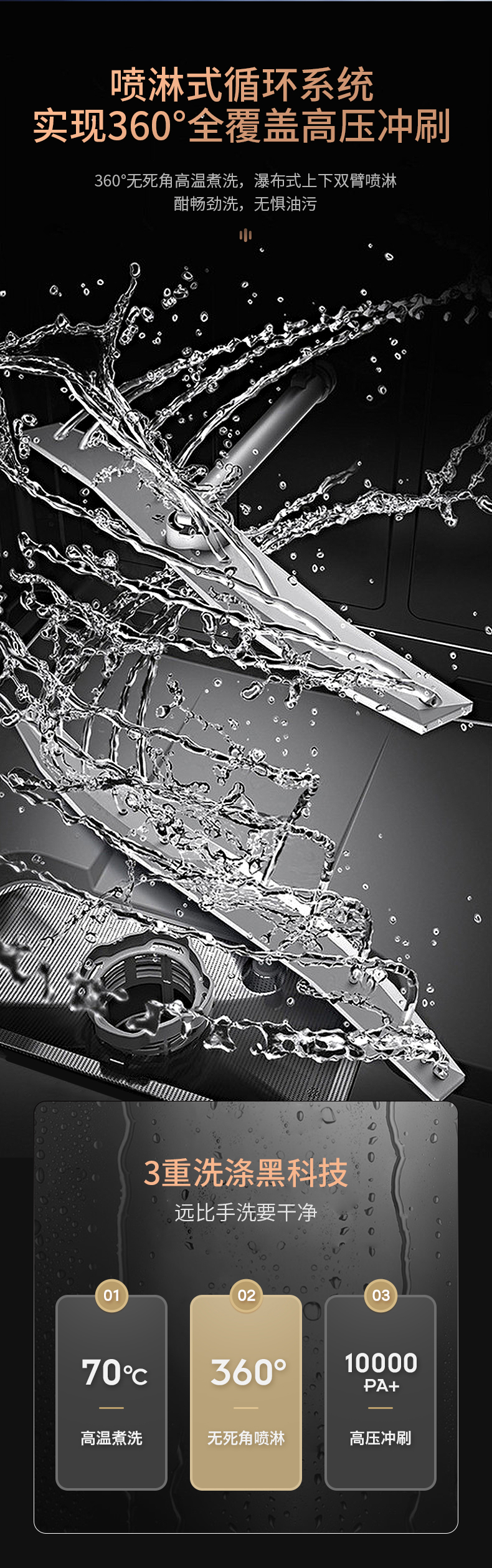 喷淋式循环系统,实现360°全覆盖高压冲刷。360°无死角高温煮洗,瀑布式上下双臂喷淋,酣畅劲洗,无惧油污。