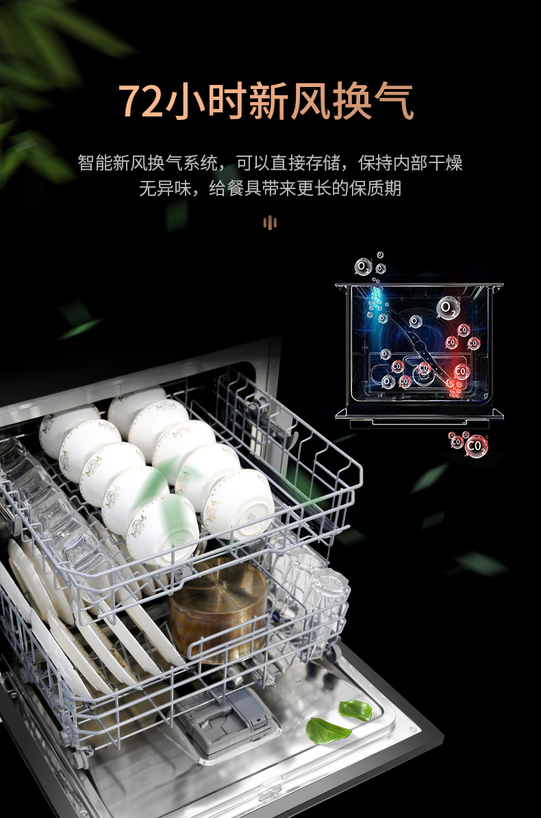 智能新风换气系统,可以直接存储,保持内部干燥无异味,给餐具带来更长的保质期,让消费者拥有更洁净的体验。