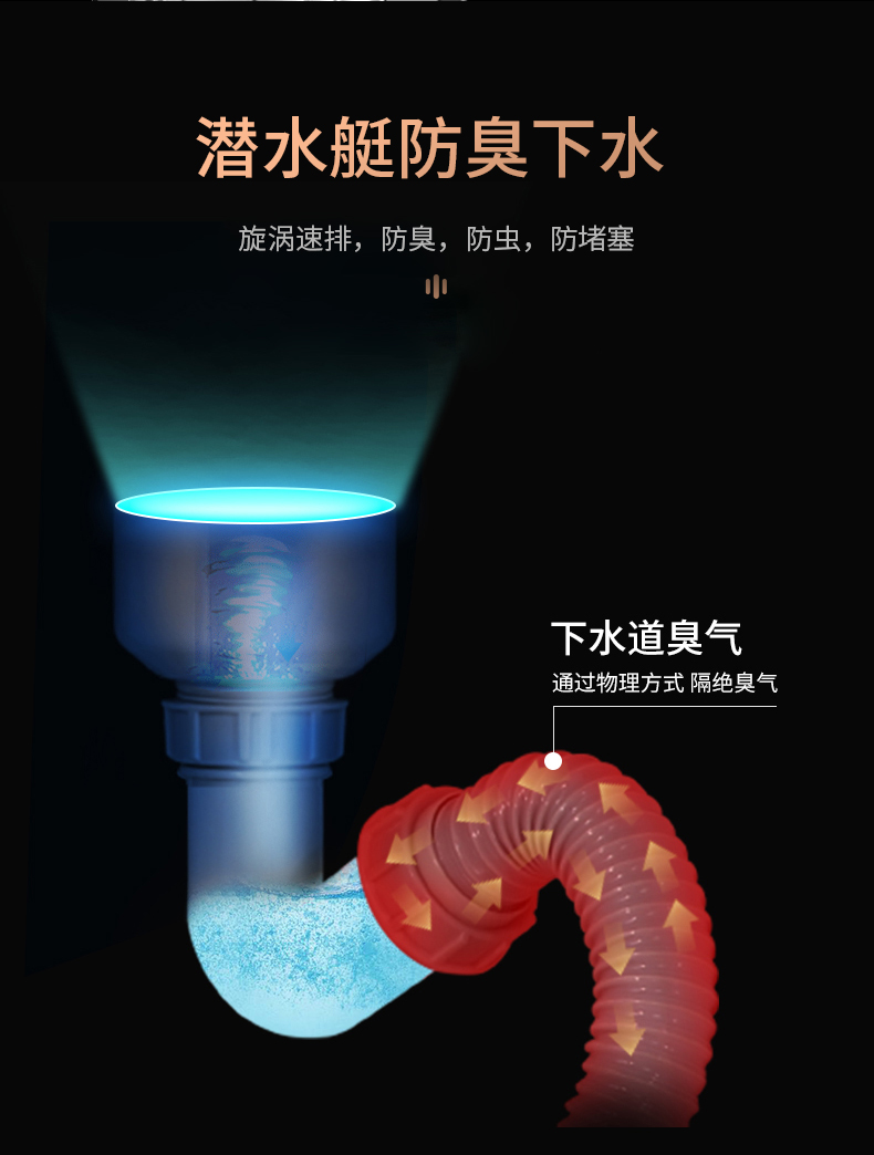 潜水艇式旋涡速排,防臭,防虫,防堵塞,轻松解决下水道难题。