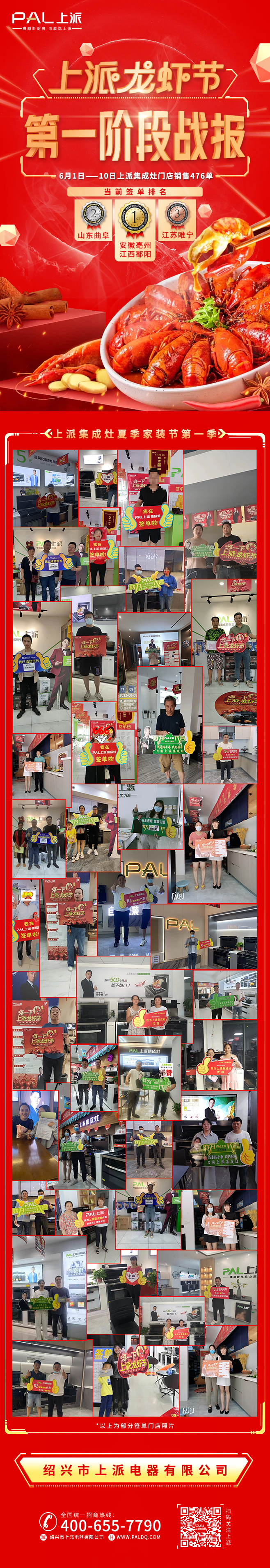 上派龙虾节自2022年6月1日开启以来,热度一直居高不下,上派全国各地旗舰店纷纷投入活动备战中。经过经销商与上派总公司专员的努力,上派龙虾节首战告捷,第一阶段狂售476单,傲视群雄!