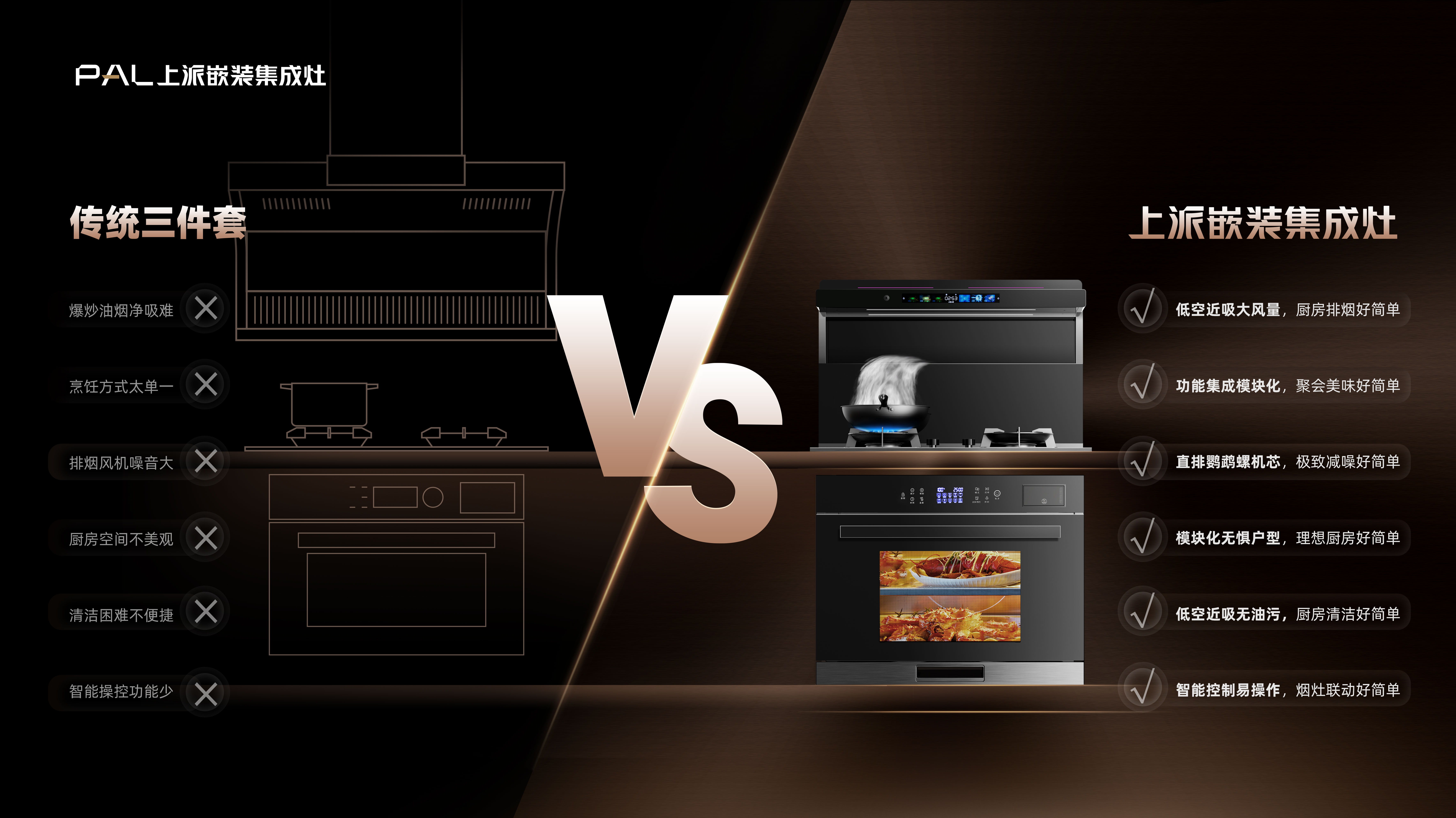 所以,上派嵌装集成灶应运而生,它既传承了传统集成灶的高吸力特点,更拥有了传统三件套的高性价比,将二者的优点合二为一,更衍生了更多能让用户拥有更好厨房体验的优点: