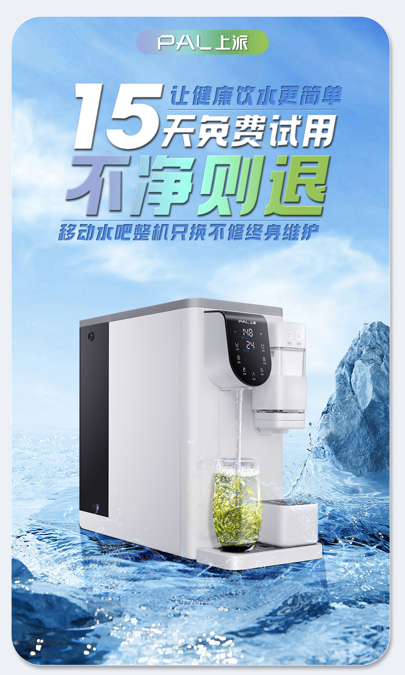 上派电器让健康饮水更简单,15天免费试用,不净则退。移动水吧整机只换不修中终身维护。