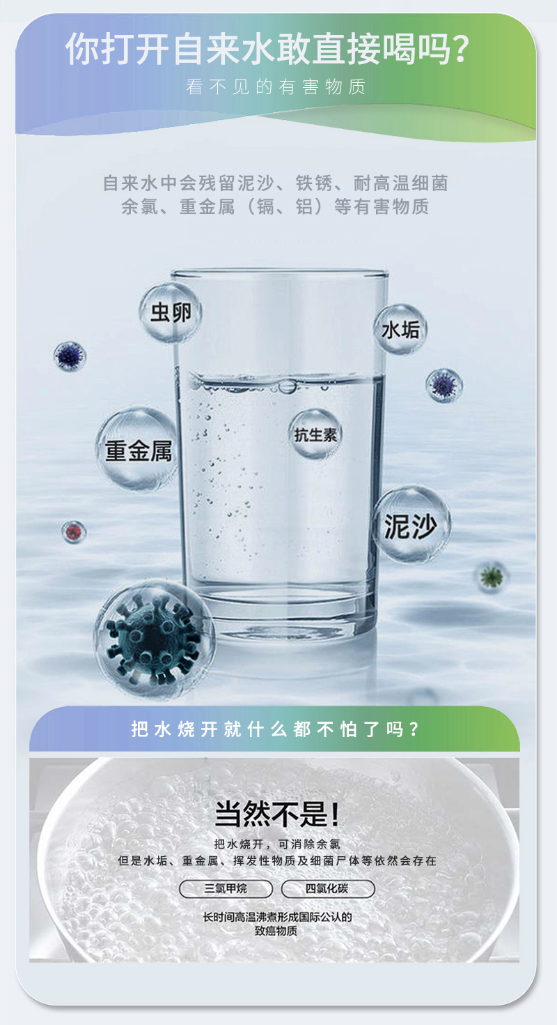 你打开自来水敢直接喝吗?看不见的有害物质,自来水中会残留泥沙、铁锈、耐高温细菌余氯、重金属(镉、铝)等有害物质随水而来。把水烧开就什么都不怕了吗?当然不是!把水烧开,可消除余氯,但是水垢、重金属、挥发性物质及细菌尸体等依然会存在。三氯甲烷,四氯化碳等,长时间高温沸煮形成国际公认的致癌物质。所以,你每天喝的水必须要严格管控,一家人的健康饮水刻不容缓。