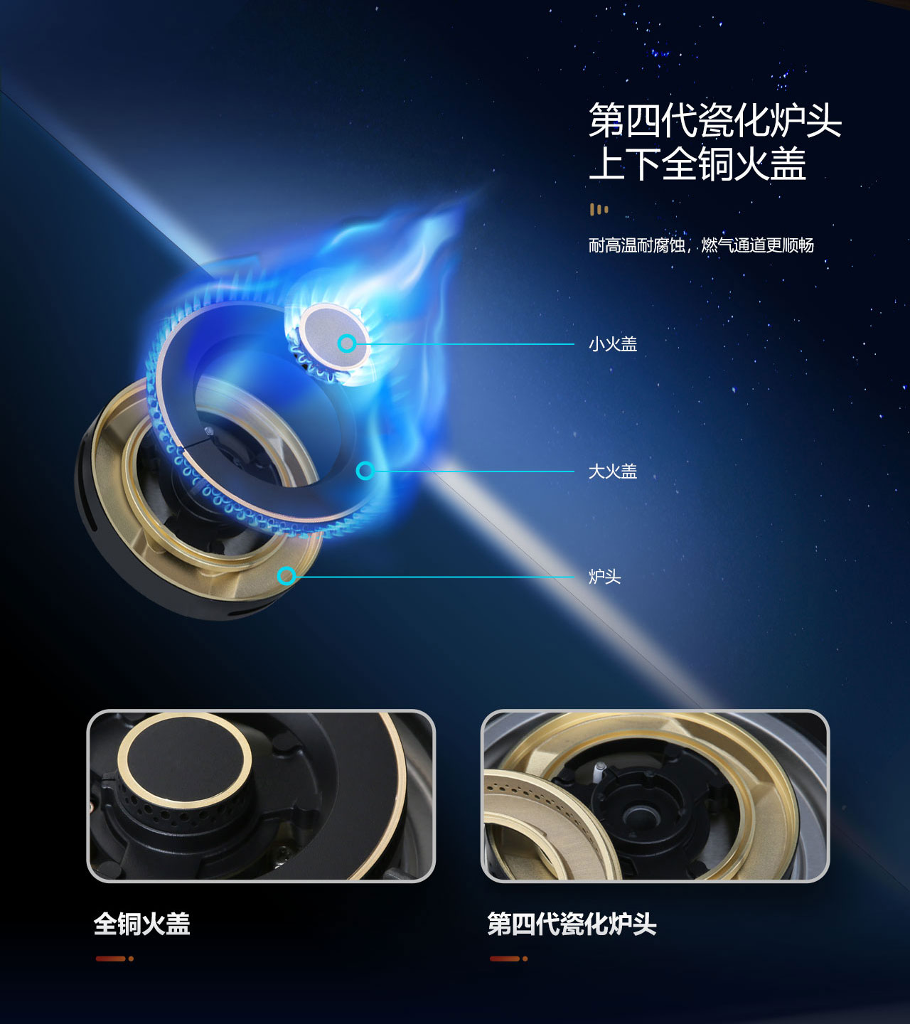 第四代瓷化炉头,上下全铜火盖,耐高温耐腐蚀,燃气通道更顺畅。连续脉冲点火,意外熄火?;?。5.0W火力,满足爆炒需求,大火够猛,小火够稳,双灶聚能环,提高燃烧性能。