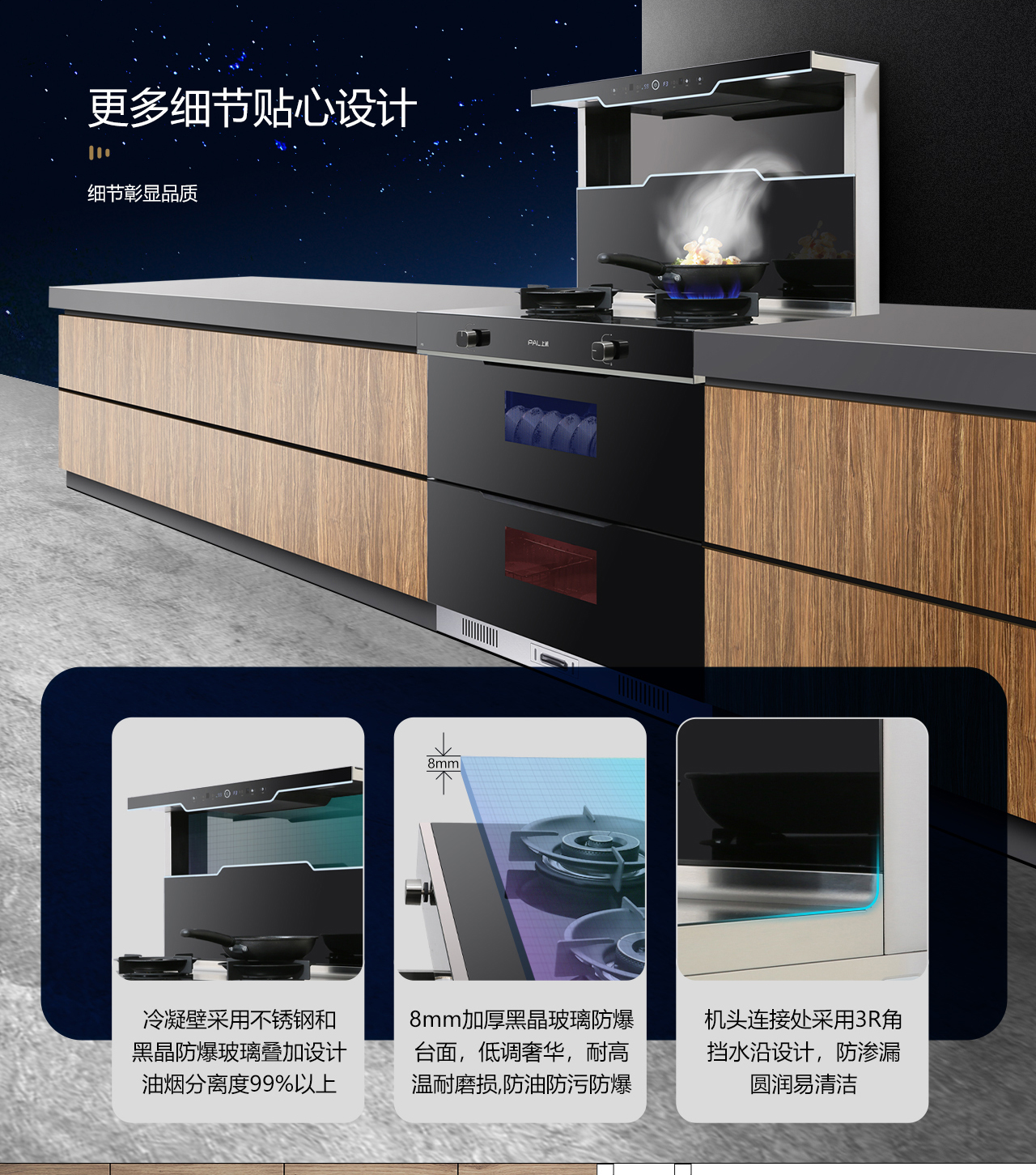 更多细节贴心设计,冷凝壁采用不锈钢和黑晶防爆玻璃叠加设计油烟分离度99%以上,8mm加厚黑晶玻璃防爆台面,低调奢华,耐高温耐磨损,防油防污防爆。机头连接处采用3R角挡水沿设计,防渗漏圆润易清洁。内部易清洗,电加热自动清洗功能,高温加热15分钟,溶解顽固油污,高速旋转排出。
