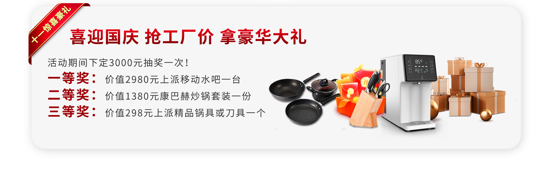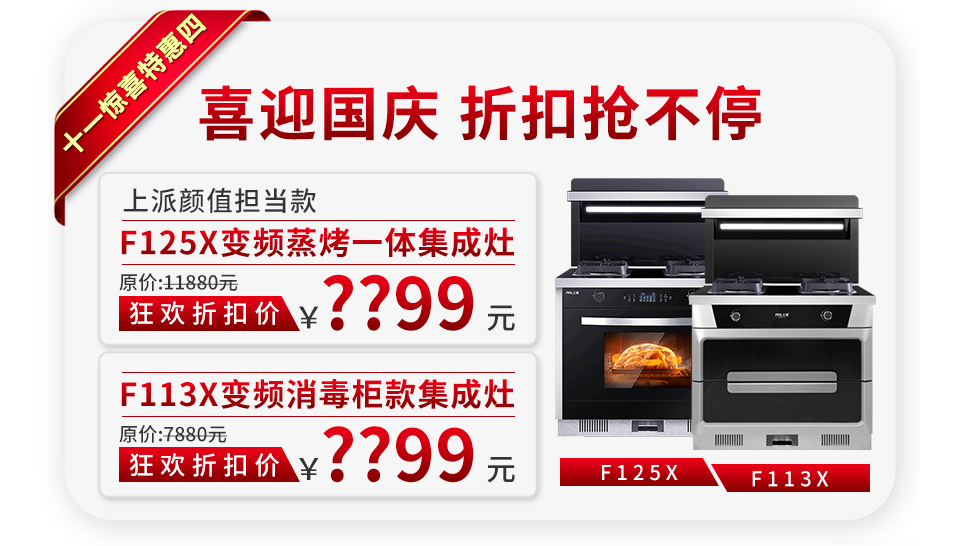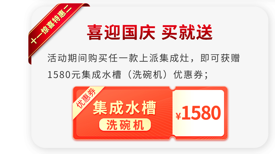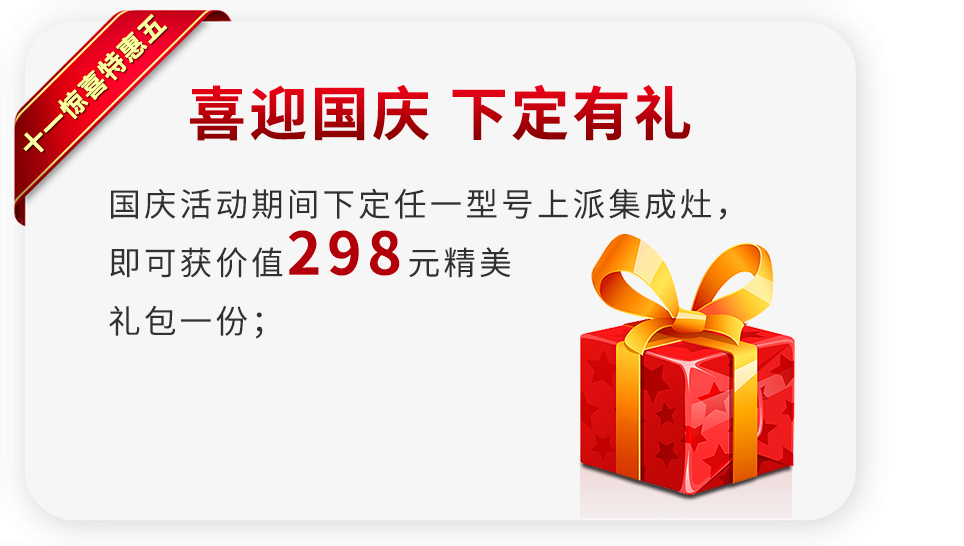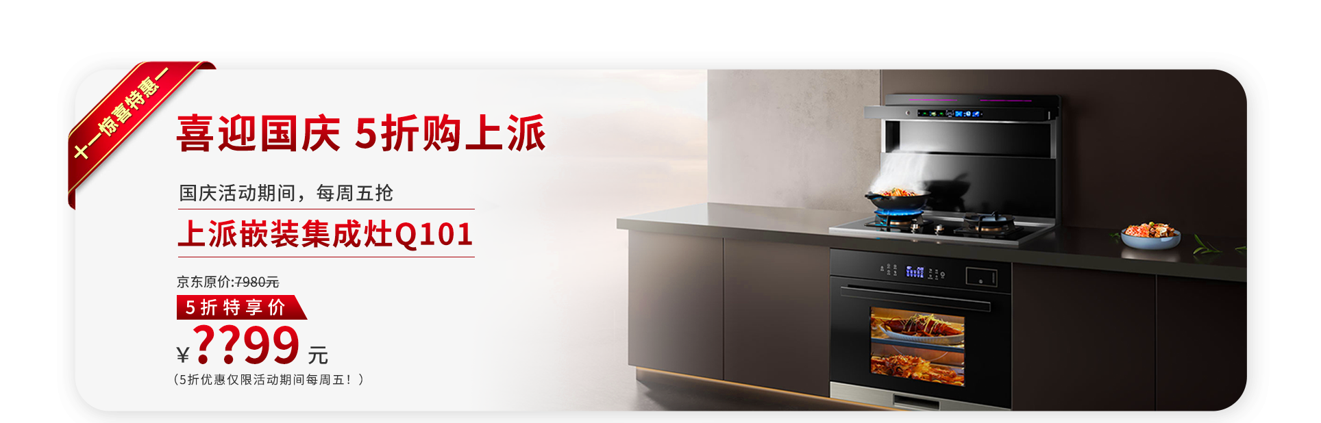 喜迎国庆,5折购上派。国庆活动期间,每周五抢【上派嵌装集成灶Q101】京东原价¥7980元,5折特享价¥3999元(5折优惠活动仅限活动期间每周五!数量有限,先到先得)