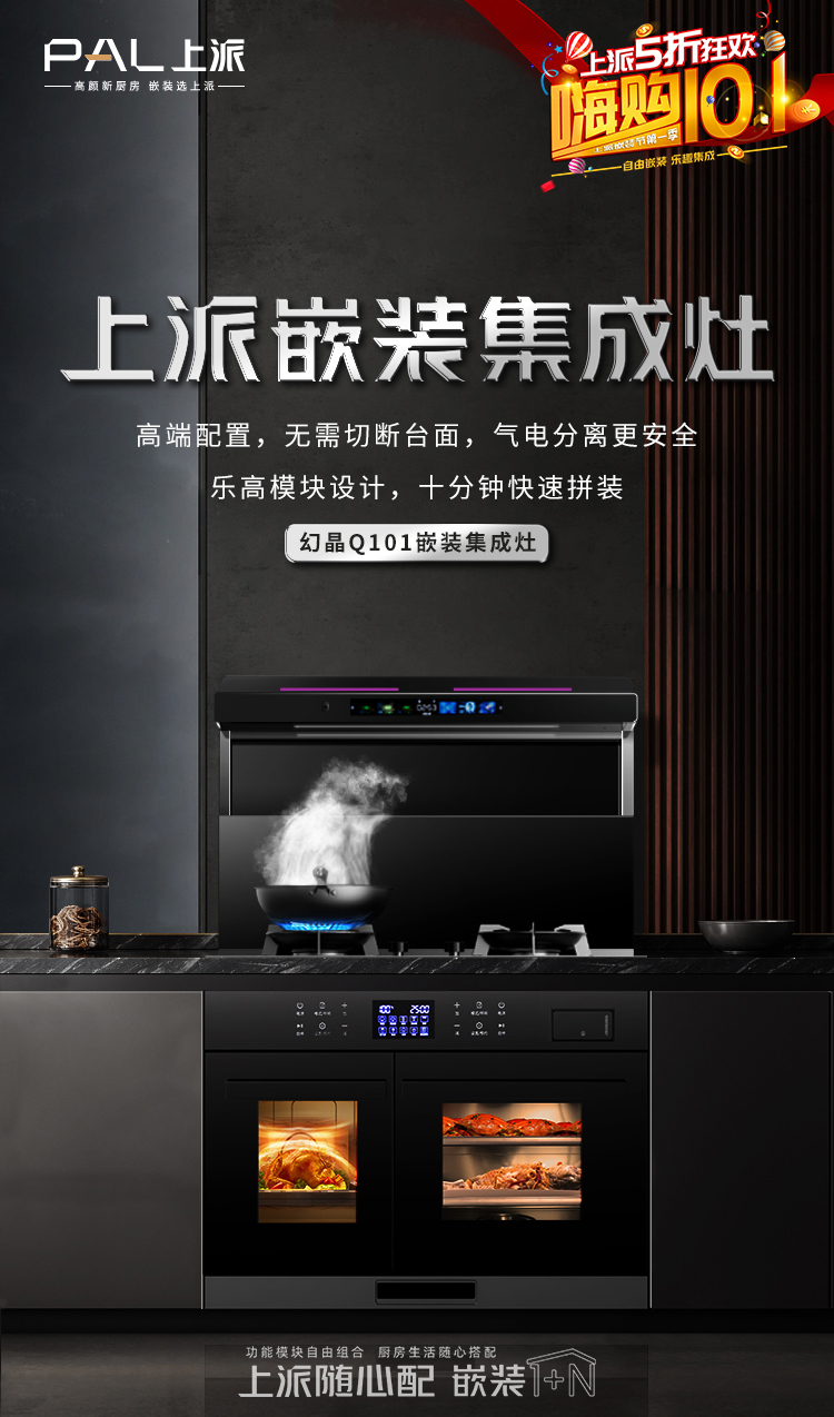 上派嵌装节第一季,喜迎国庆,5折购上派。国庆活动期间,每周五抢【上派嵌装集成灶Q101】京东原价¥7980元,5折特享价¥3999元,5折优惠活动仅限活动期间每周五【数量有限,先到先得】