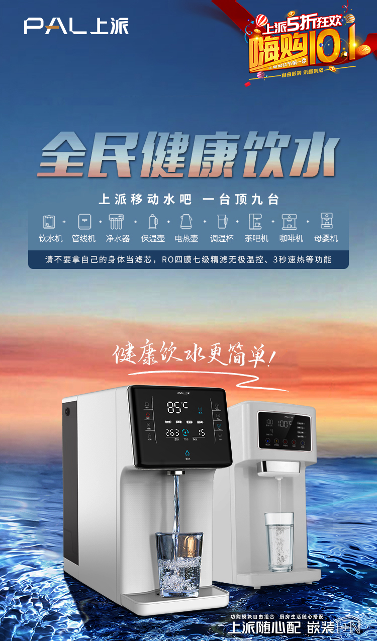 购上派任一款集成灶加799元,即可领取价值2980元。上派移动净水器一台,先体验后付款,免费体验十五天,满意后再付款。
