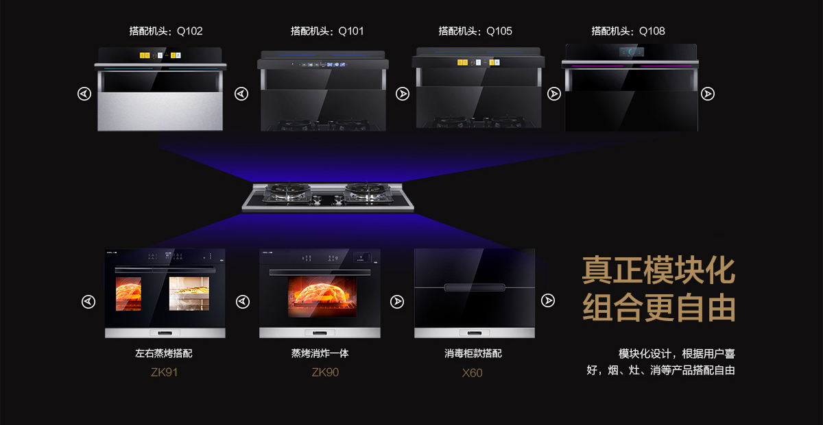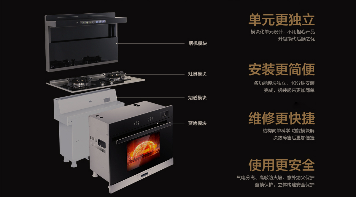 烟灶+左烤右蒸、烟灶+蒸烤一体、烟灶+消毒柜随心换装,设备轻松拆卸升级,模块化设计拆卸简单,焕新升级轻松搞定,随时更新你的私人厨房。