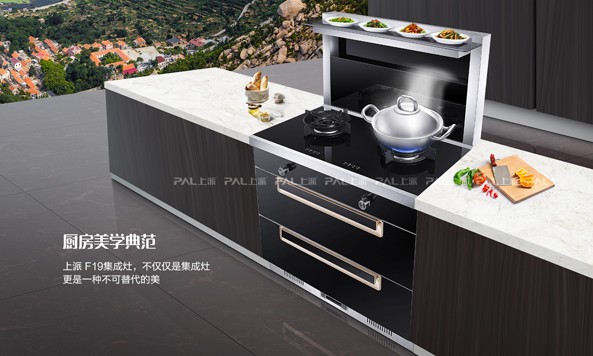 提高生活品质,从厨房开始。集成灶十大品牌上派集成灶F19,99.96%油烟吸净率,采用微空气动力学原理,侧吸下排,在不影响操作视线和不经过人体呼吸途径的前提下,将油烟在未扩散前瞬吸瞬排,当吸入油烟腔内温度过高,自动切断电源,让厨房生活变得智能安全!