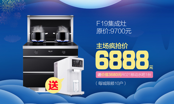 我的地盘你做主,上派集成灶F19主场疯抢价,6888元就能领回家,并赠送价值3680元的上派移动水吧一台。全城仅限10户,数量有限!先到先得!双节钜惠于9月15日打响双节促销,活动一直持续到10月7日,等你来抢购。